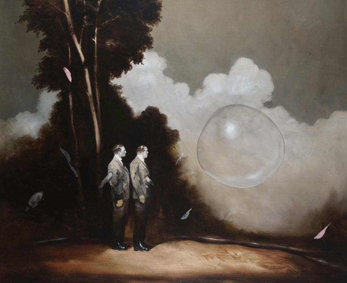 In de schilderijen van Radu Belcin blijven ouderwets aangeklede mannen, zo weggelopen