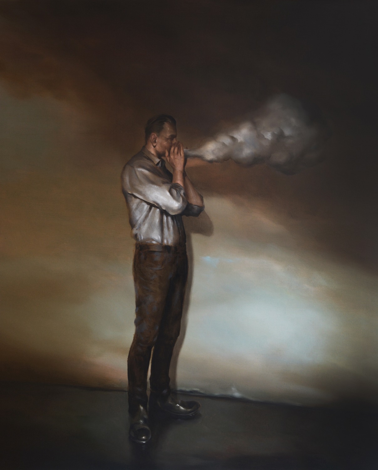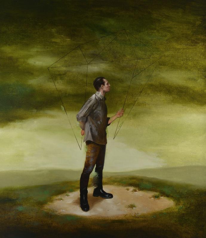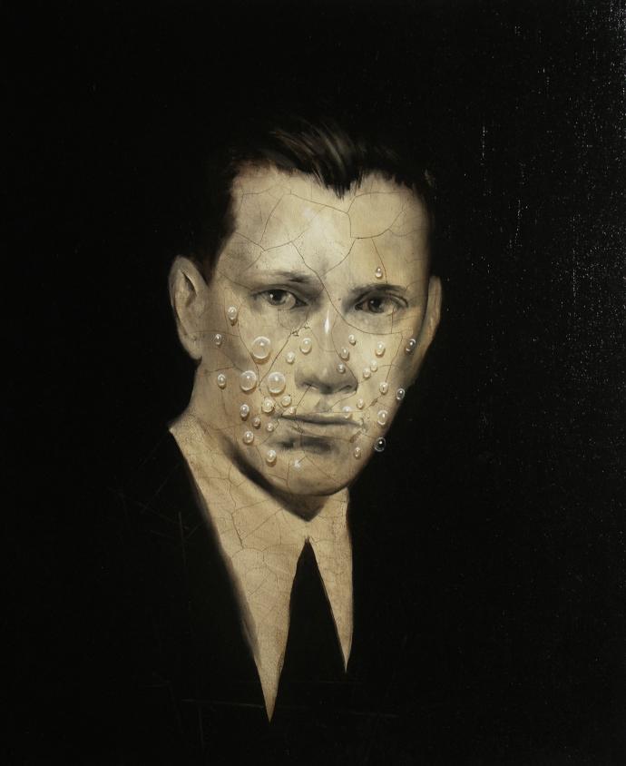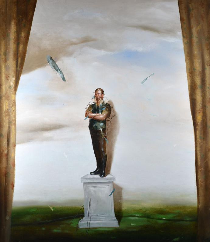 In de schilderijen van Radu Belcin blijven ouderwets aangeklede mannen, zo weggelopen