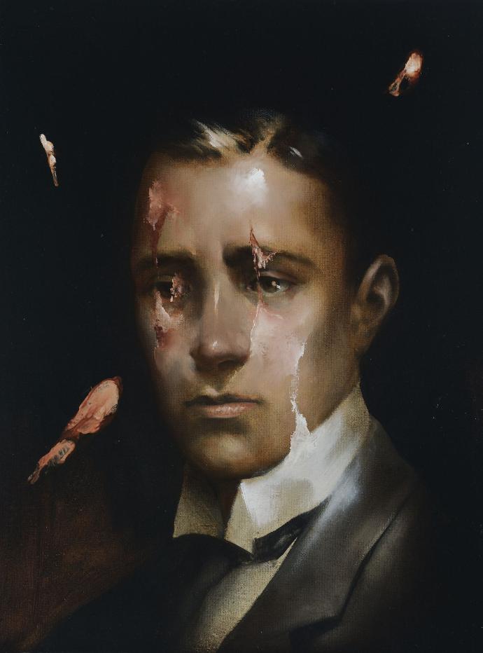 bustes schildert, soms expliciet gepresenteerd tussen gordijnen, schudt hij het verleden