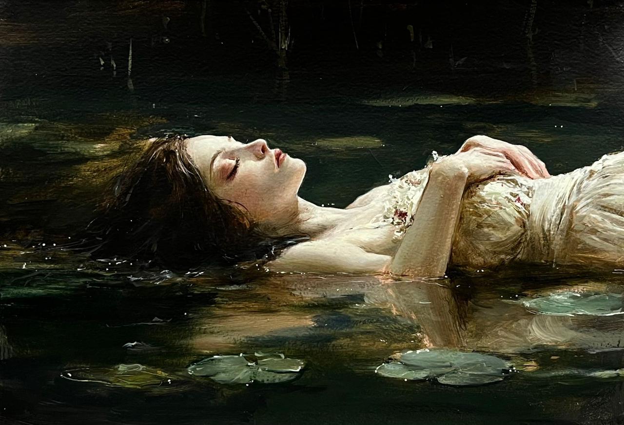 Ophelia daarentegen vertegenwoordigt het tegenovergestelde: overgave aan emotie, chaos en het verlies van controle. Ze verdrinkt letterlijk en figuurlijk in haar gedachten en gevoelens, gevangen in een mentale wereld van pijn en herinneringen. Omgeven door duister water en waterlelies, toont haar kleurenpalet diepe groene, blauwe en zwarte tinten, die de zwaarte van haar innerlijke strijd benadrukken.